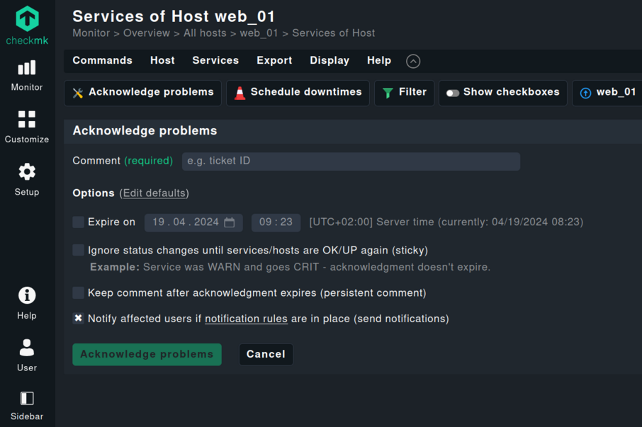 2.3 版增强了 Checkmk 中的许多工作流程,使其更加直观。该版本改进了 Checkmk 中的确认信息和相关命令对话框,使其更加统一和用户友好。尤其是用于安排停机时间(“Schedule downtime”)和确认问题(“Acknowledge problem”)的对话窗口现在更加清晰易用。您可以立即看到哪些选项可用及其效果。