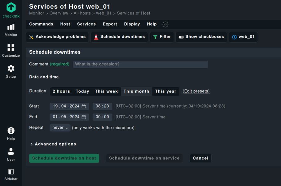 为防止出错并使过期日期更清晰可见,确认问题的对话窗口现在会显示当前服务器时间。在配置停机时间(“Schedule downtime”)时,可以从上到下轻松浏览命令对话框中的各种选项。此外,您还可以根据浏览器的默认设置,通过用户友好的选择字段来设置日期和时间。