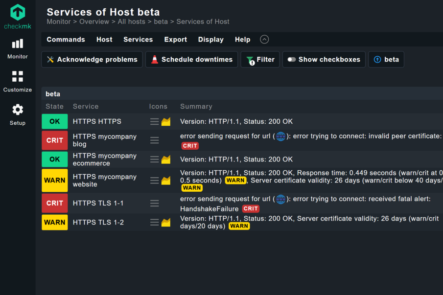 得益于 Checkmk 2.3 中的现代网络服务监控功能,从现在起,您只需一条规则即可将各种端点纳入监控,从而节省时间并保持监控有序。使用Checkmk监控您的网站和它们的证书,即使监控数百个网站,也能查看概览页面。接收有关网站各种问题的详细警报,包括: