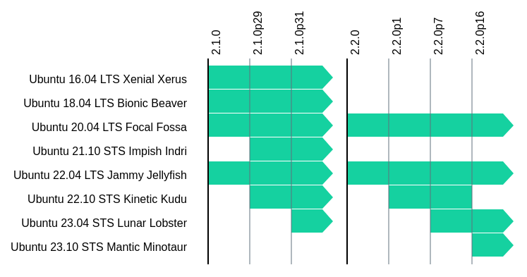 我们偶尔会收到在新版本操作系统上构建旧版本 Checkmk 的请求,或者将相对较新的 Checkmk 与早已停用的发行版结合使用的请求。为了回答这些问题,我们在手册的各个章节中都加上了这些图表。具体来说,这意味着您可以找到全部信息,哪怕是要将 Ubuntu 14.04 上的“可能不知道放在哪里的”Checkmk 1.5.0升级到最新的 2.2.0 版本并在Ubuntu 22.04上使用。